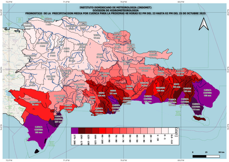 “El sábado, MELISSA estaría moviéndose lentamente sobre el Mar Caribe, ganando latitud mientras se fortalece paulatinamente, por tanto, continuaremos bajo condiciones de alto riesgo de inundaciones severas repentinas y/o graduales, así como, deslizamiento de tierra sobre gran parte de nuestra nación, debido a las precipitaciones que ocurrirán durante periodos prolongados y de fuerte intensidad en gran parte de nuestro territorio que estará generando este sistema tropical. Las áreas donde estas condiciones serán más notorias serán aquellos poblados ubicados en el noreste, sureste, suroeste y la cordillera Central, es decir: María Trinidad Sánchez, La Vega, Monseñor Nouel, Samaná, Duarte, Sánchez Ramírez, Hermanas Mirabal, Espaillat, San Cristóbal, San José de Ocoa, Monte Plata, Peravia, Azua, San Juan, Independencia, Bahoruco, Pedernales, Barahona, Hato Mayor, El Seibo, La Romana, San Pedro de Macorís, La Altagracia, El Gran Santo Domingo, entre otras” advierte el Indomet