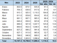 En diciembre de 2025 se recibieron US$1,098.4 millones, un incremento de US$94.9 millones (9.5 %), respecto a diciembre de 2024